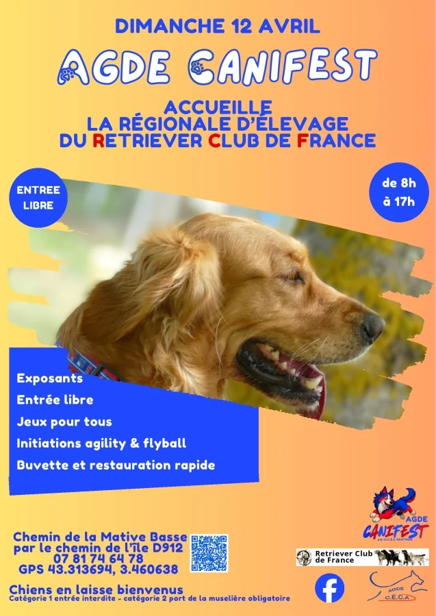 Le dimanche 12 avril 2026, la ville d’Agde accueille l’Agde Canifest, un grand rassemblement canin organisé par le Club d’Éducation Canine d’Agde. L’événement se déroulera de 8h à 17h au Chemin de la Mative Basse, par le chemin de l’île D912, à La Tamarisière, Agde. Cette journée exceptionnelle est marquée par l’accueil de la Régionale d’Élevage du Retriever Club de France, un rendez-vous de référence pour les amateurs et passionnés de la race.