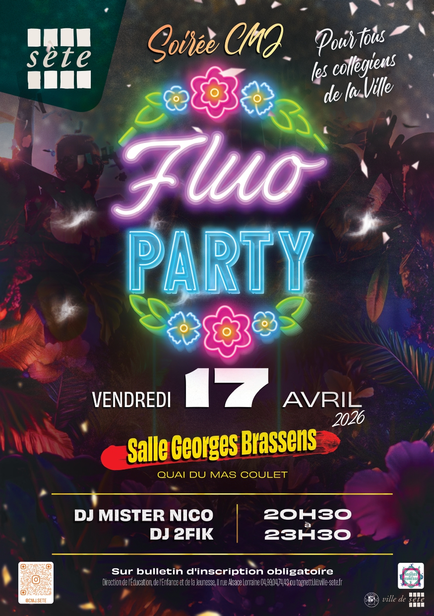 Le Conseil municipal des jeunes (CMJ) de Sète organise une Fluo Party exceptionnelle pour tous les collégiens de la ville ! Rendez-vous le vendredi 17 avril 2026, de 20h30 à 23h30, à la Salle Georges Brassens, située Quai du Mas Coulet, 34200 Sète.