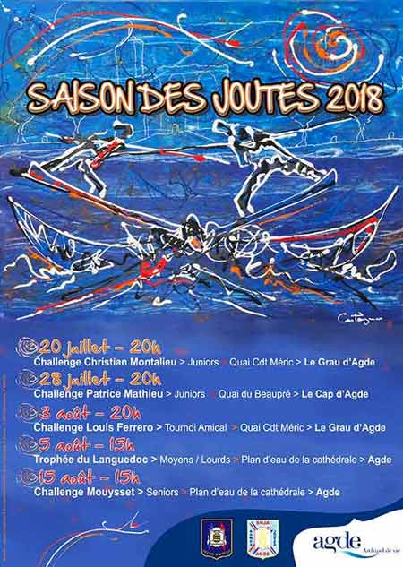 Saison des Joutes 2018-Agde-Cap d’Agde. Retrouvez les infos, dates, lieux, horaires des différents tournois de Joutes. Tournois de Juin à Septembre sur la commune d’Agde, Cap d’Agde et Grau d’Agde. Découvrez en Famille ce spectacle des joutes Languedociennes, ses festivités, son folklore…