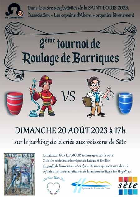Tournoi de Roulage de Barriques Sète. Dimanche 20 Аoût 2023 à 17h00. Sur le parking de la criée aux poissons de Sète. 2ème tournoi de Roulage de Barriques. Organisé dans le cadre des festivités de la SAINT LOUIS 2023, par l’association « Les copains d’Abord ».