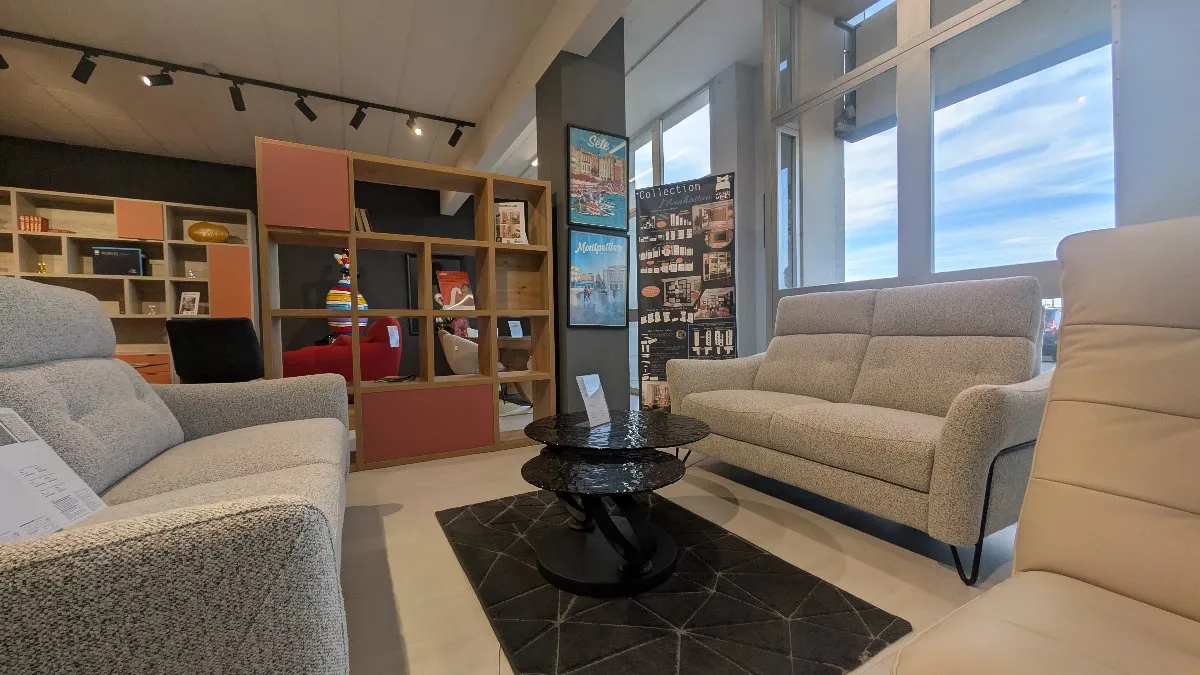 Installé Quai du Pavois d’Or, à deux pas de la gare SNCF de Sète, M.T. Meubles s’impose comme l’une des adresses incontournables du meuble et de la décoration sur le Bassin de Thau. Dès l’entrée, la grande façade vitrée laisse deviner l’ampleur du lieu : le magasin se déploie sur deux étages, offrant un véritable parcours d’inspiration à travers des espaces de vie soigneusement mis en scène.